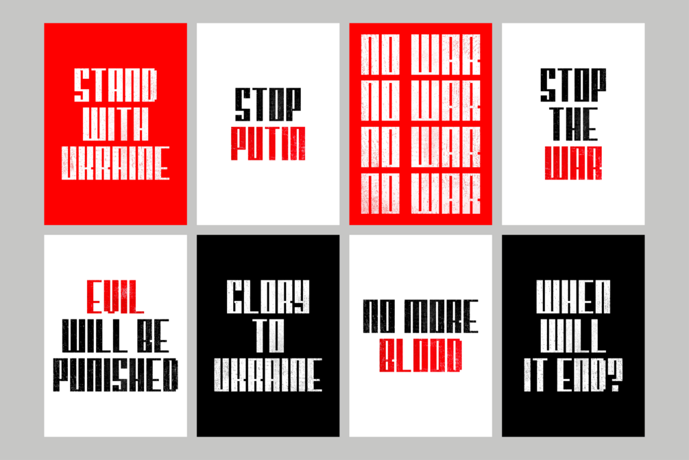 The download includes the typeface itself, plus a series of poster designs translated both into English & Ukrainian (10 designs for each language). You can pay any amount of money you would like for this package (including nothing). 100% of all money received from sales will be donated to UNICEF, which is helping vulnerable children and families during the crisis.